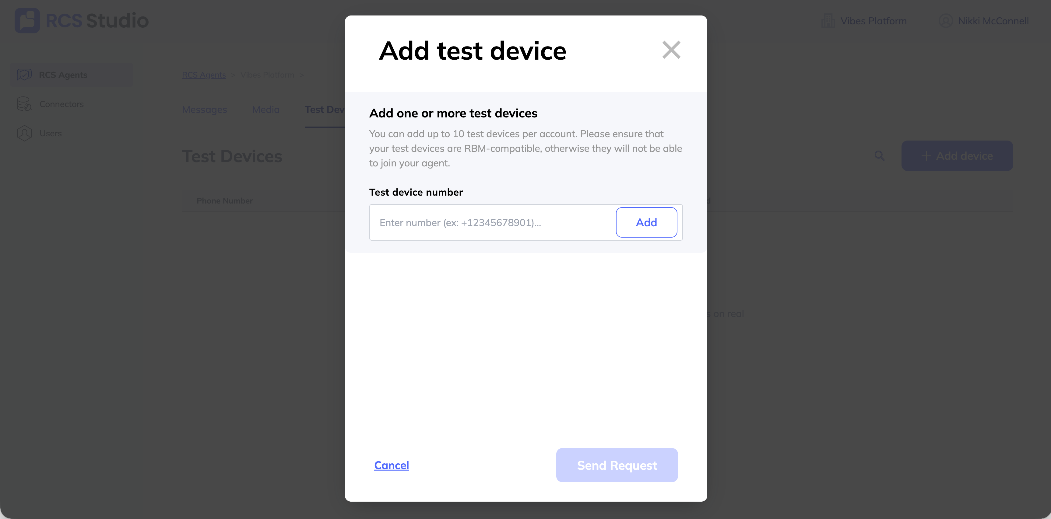 - Enter the phone number(s) of any devices you'd like to add to your agent, in E.164 format. Note that all test devices must be RCS enabled to receive RCS messages. Click Add after each number.