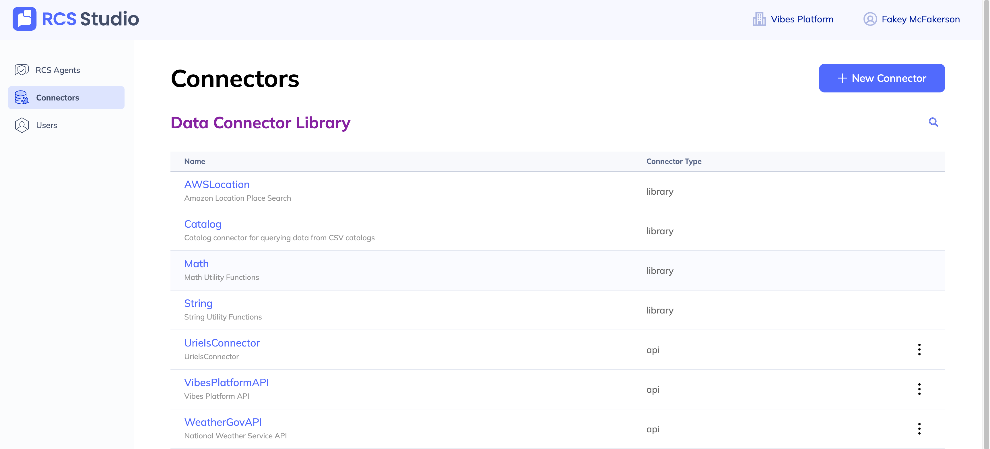 ConnectorsConnectors In this Connectors tab, you can view, update, and add connections to external APIs. Updated about 1 month ago RCS builderUsersTable of Contents Connectors