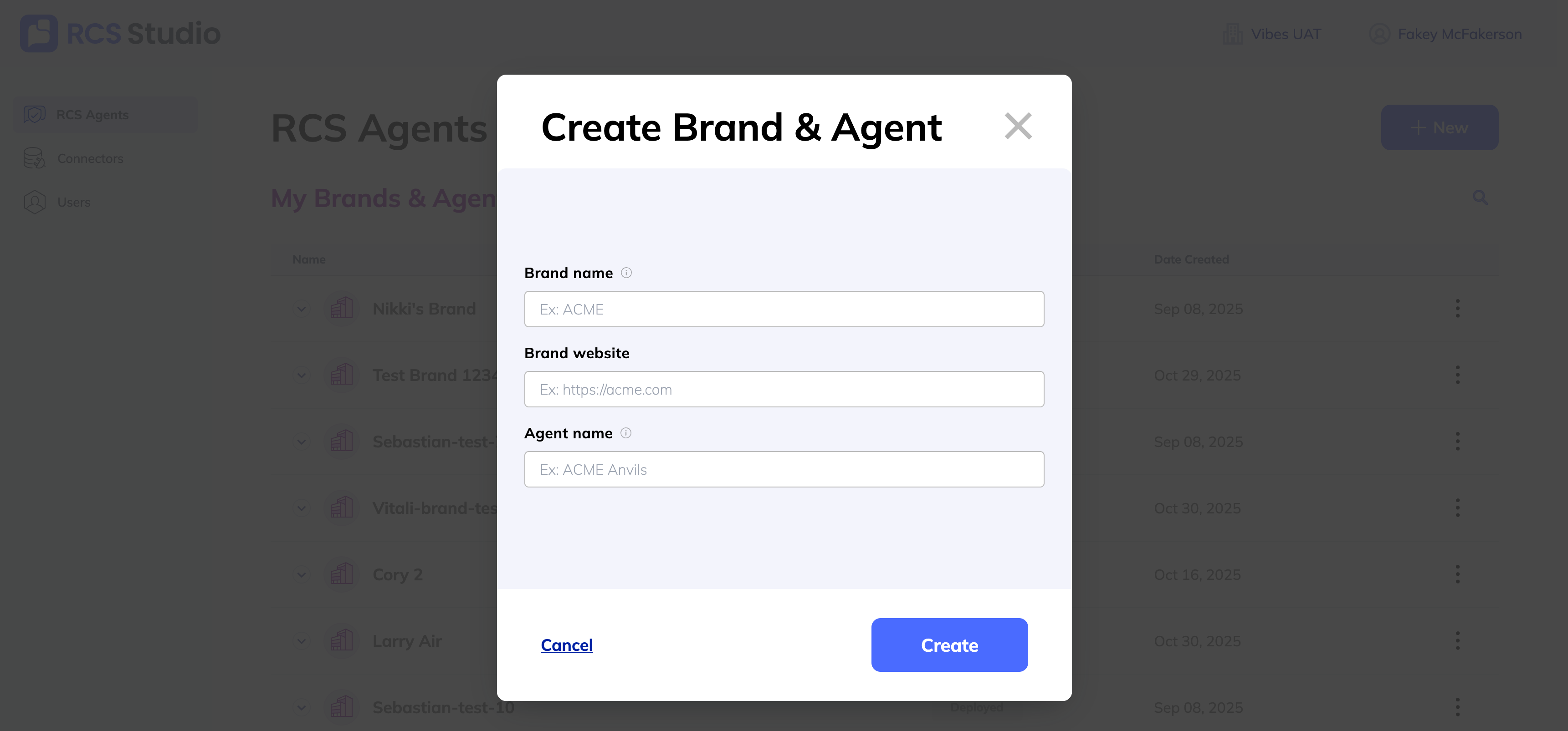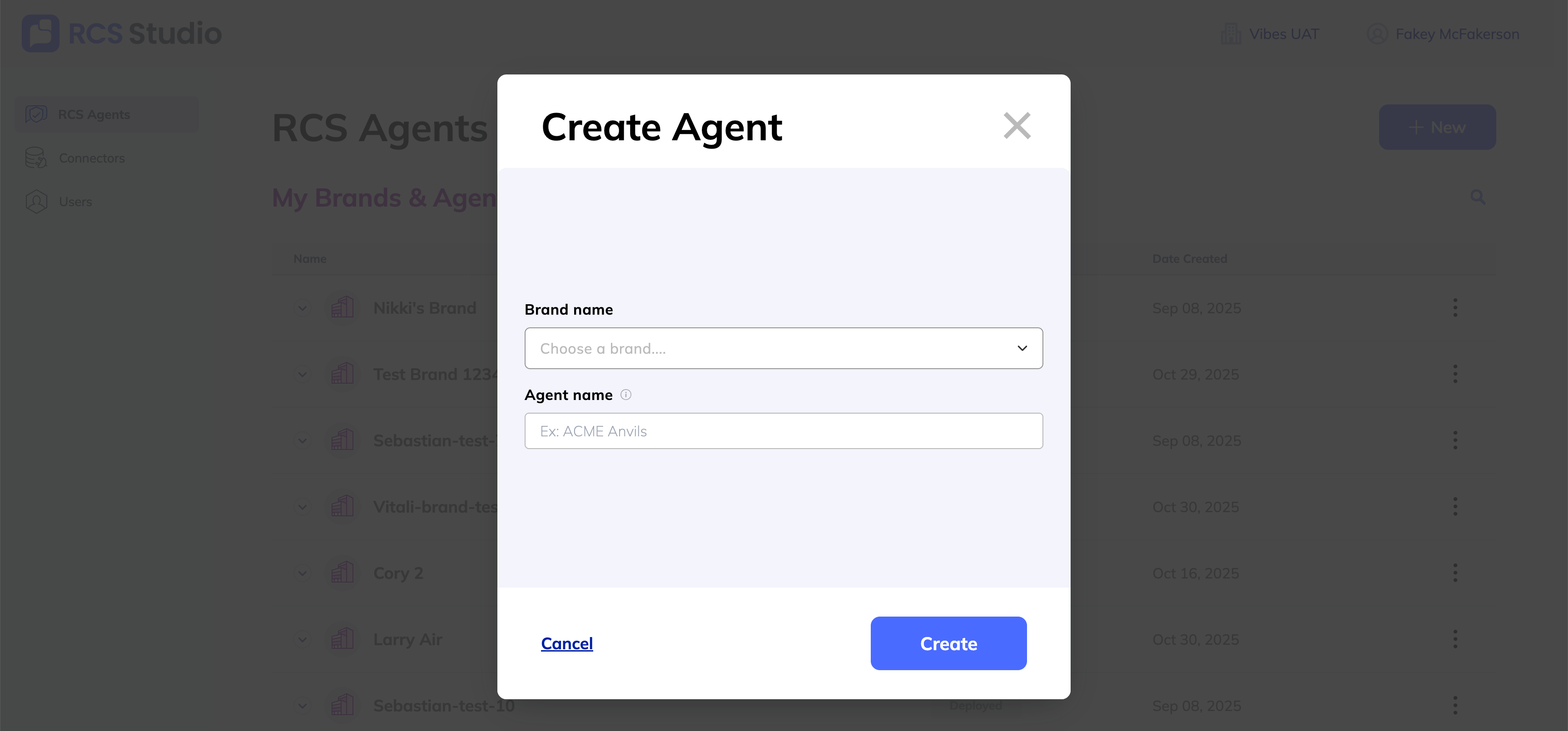 When you are creating a brand in RCS Studio, you will be prompted to create that brand's first agent at the same time.