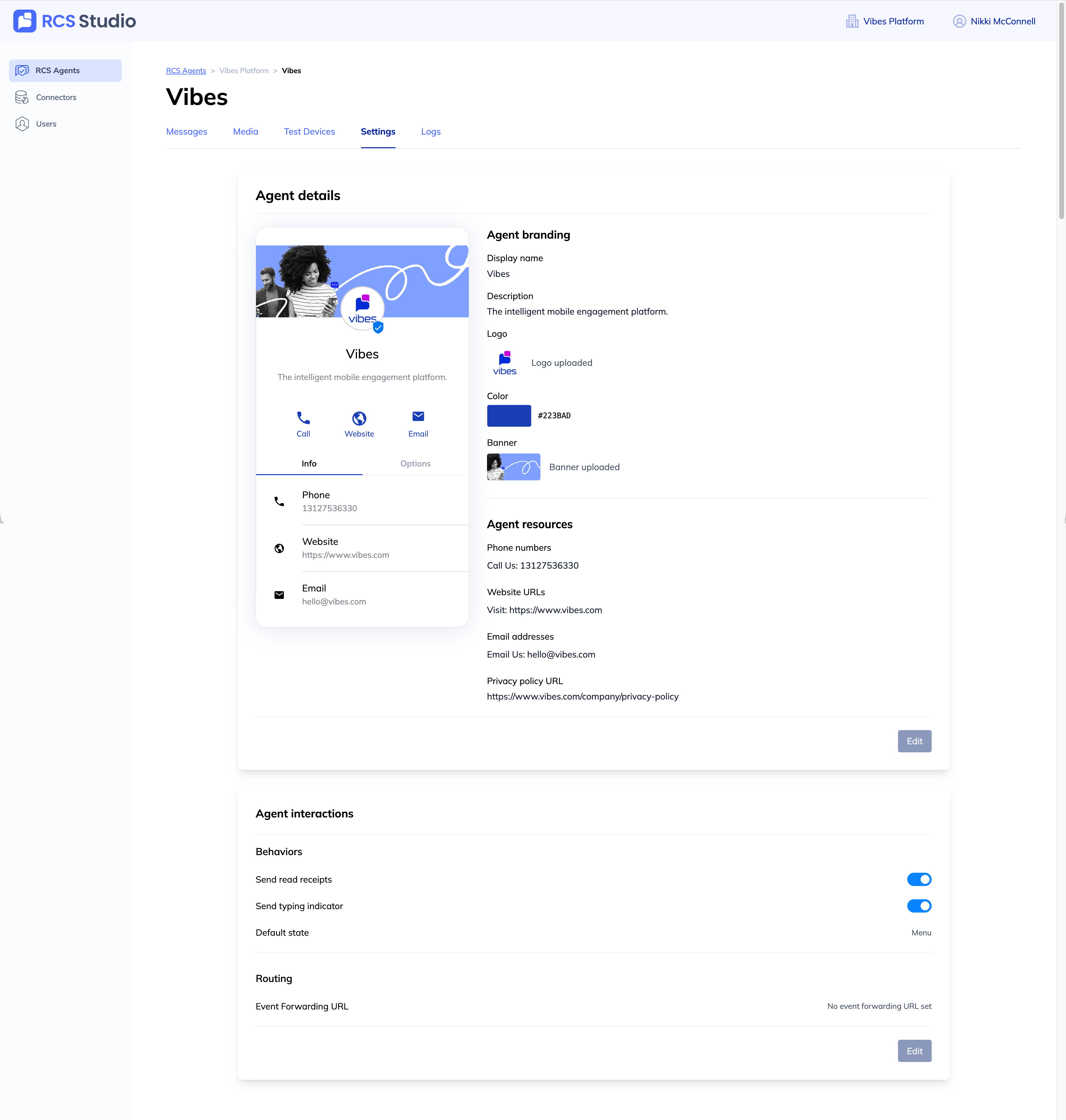 Once your agent is made, you can update certain details that will appear on the end user’s phone. To do this, navigate to your agent and open the Settings tab.