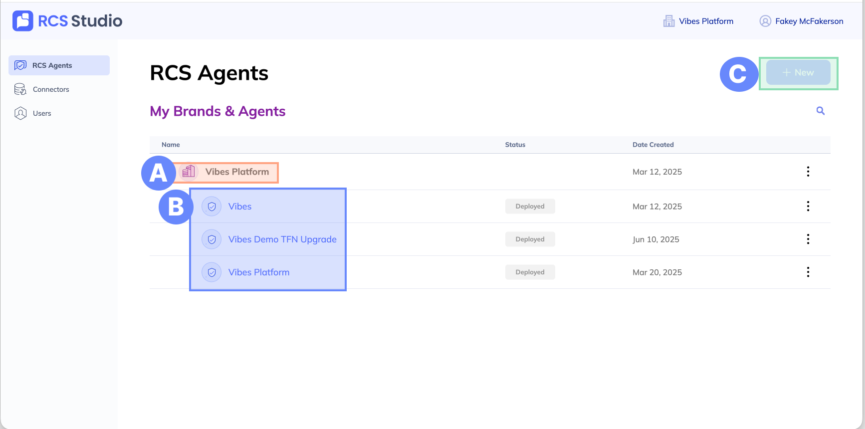 B. Agent - The "sender" of your messages. When you expand a brand, you can see all the agents available under the brand. Clicking on an agent will bring you to the agent view.